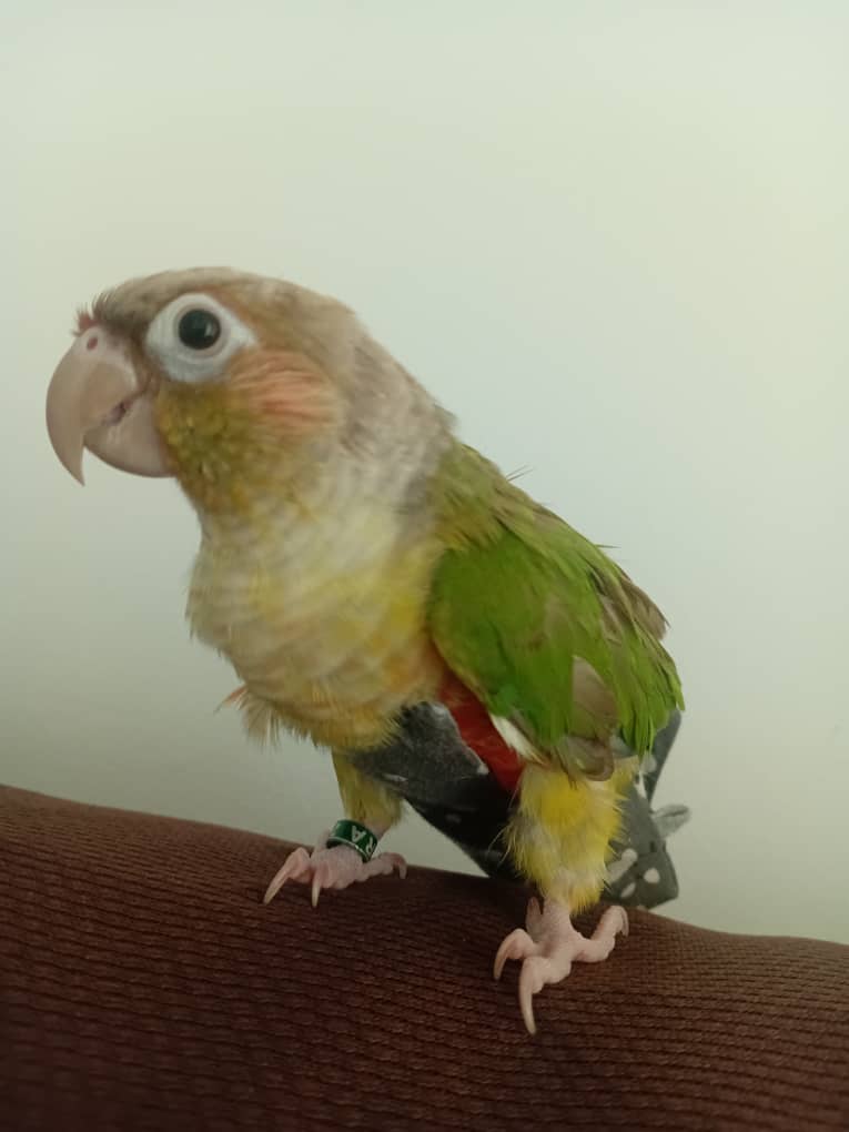 Parrot, Green Cheeked Conure, Green with grey head and red tail.