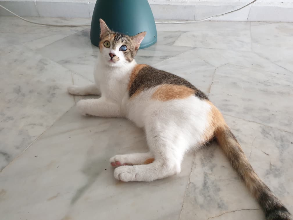 A small female cat around 1 year old. 3.5 Kg with white, orange and black fur colour. Lost in Jalan Pinggir Jalan Ipoh 51200 KL (Behind Shell)